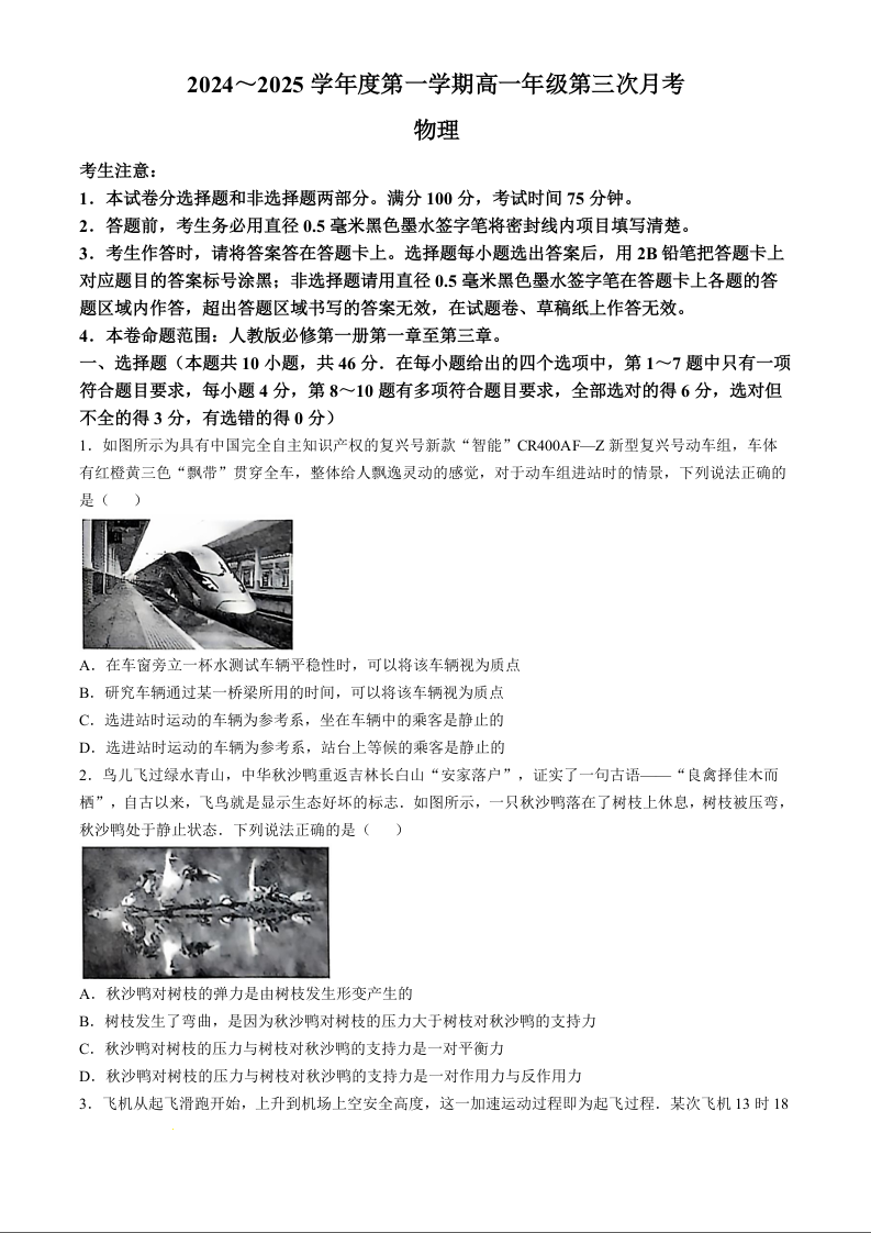河北省沧州市四县联考2024-2025学年高一上学期11月月考物理+答案