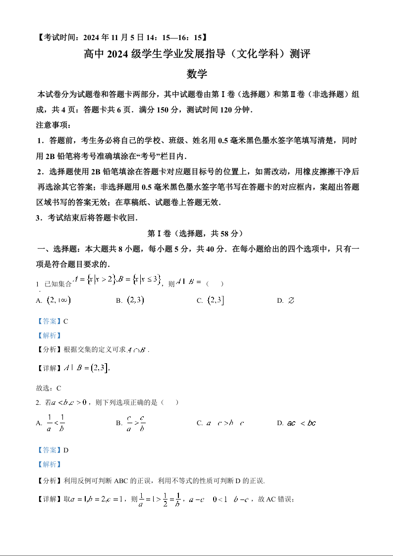 四川省绵阳市2024-2025学年高一上学期11月期中考试数学(精品解析版)