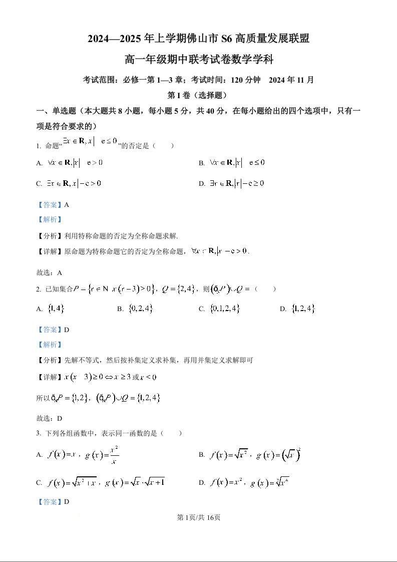 广东省佛山市S6高质量发展联盟2024-2025学年高一上学期期中联考数学(精品解析版)