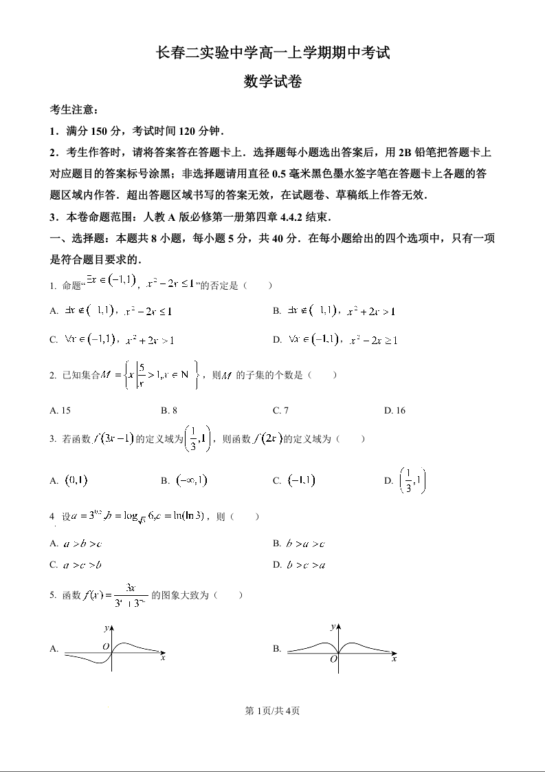 吉林省长春市第二实验中学2024-2025学年11月高一上学期期中考试数学(原卷版)