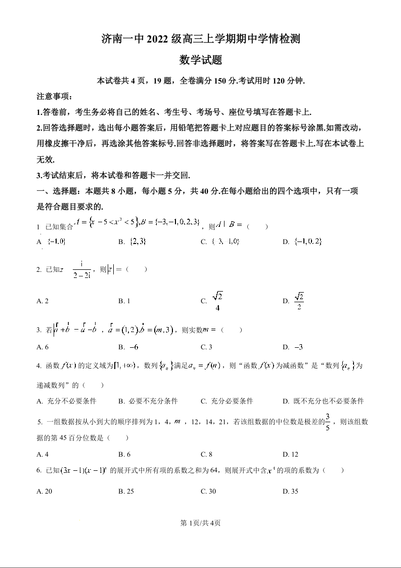 山东省济南一中2022级高三上学期期中学情检测数学(原卷版)