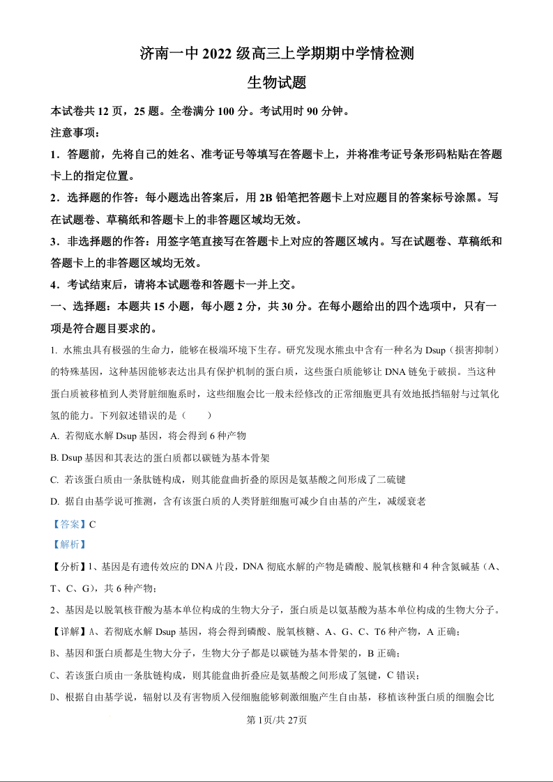 山东省济南一中2022级高三上学期期中学情检测生物(精品解析版)