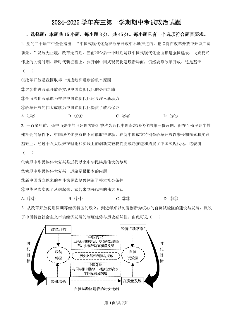 山东省济南一中2022级高三上学期期中学情检测政治(原卷版)