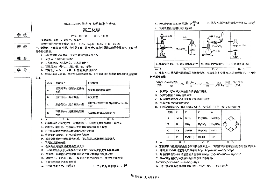 辽宁省鞍山市重点高中协作校2025届高三上学期期中考试化学
