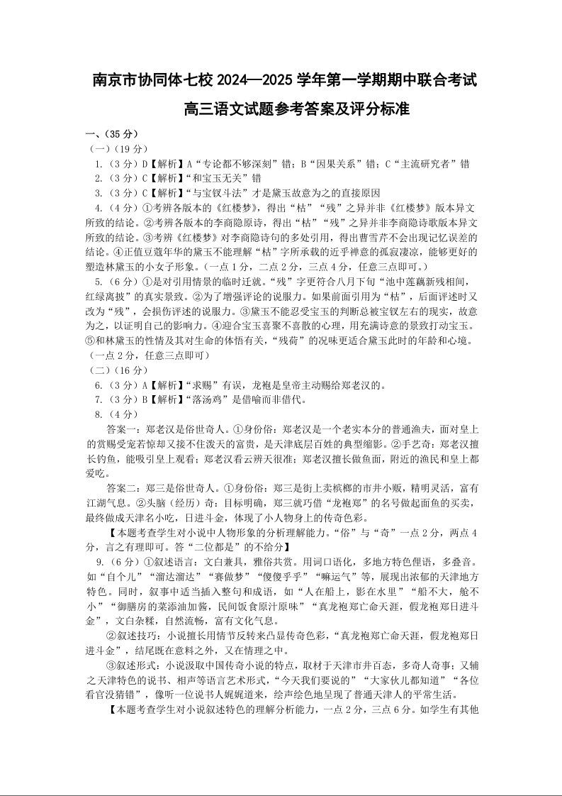 江苏省南京市协同体七校2025届高三期中联合考试语文答案