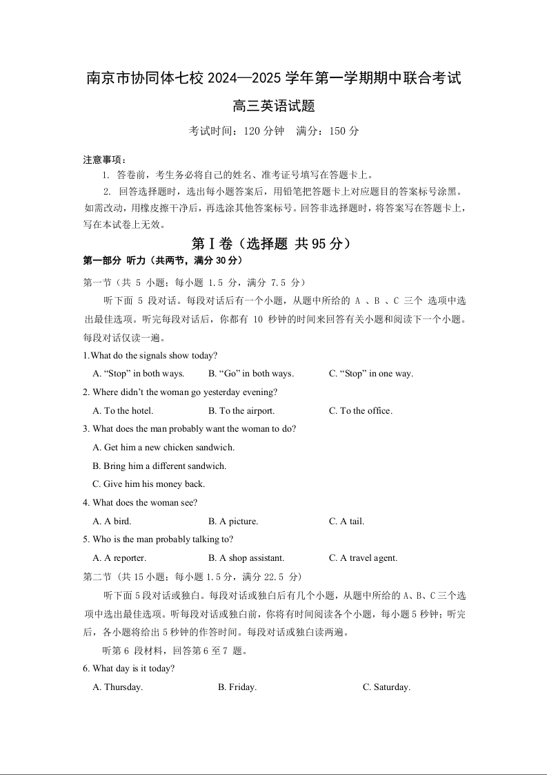 江苏省南京市协同体七校2025届高三期中联合考试英语