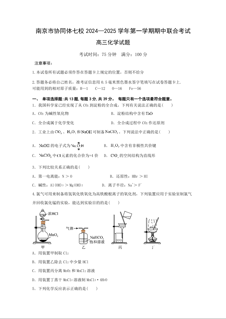 江苏省南京市协同体七校2025届高三期中联合考试化学
