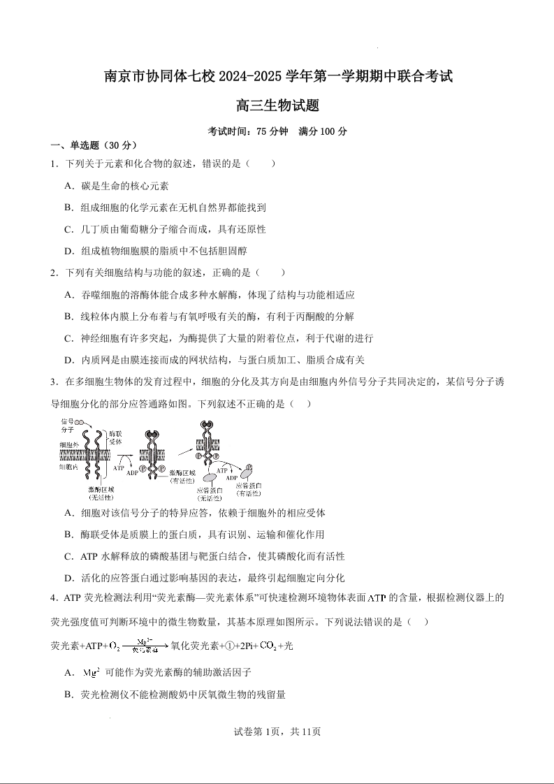 江苏省南京市协同体七校2025届高三期中联合考试生物(原卷版)