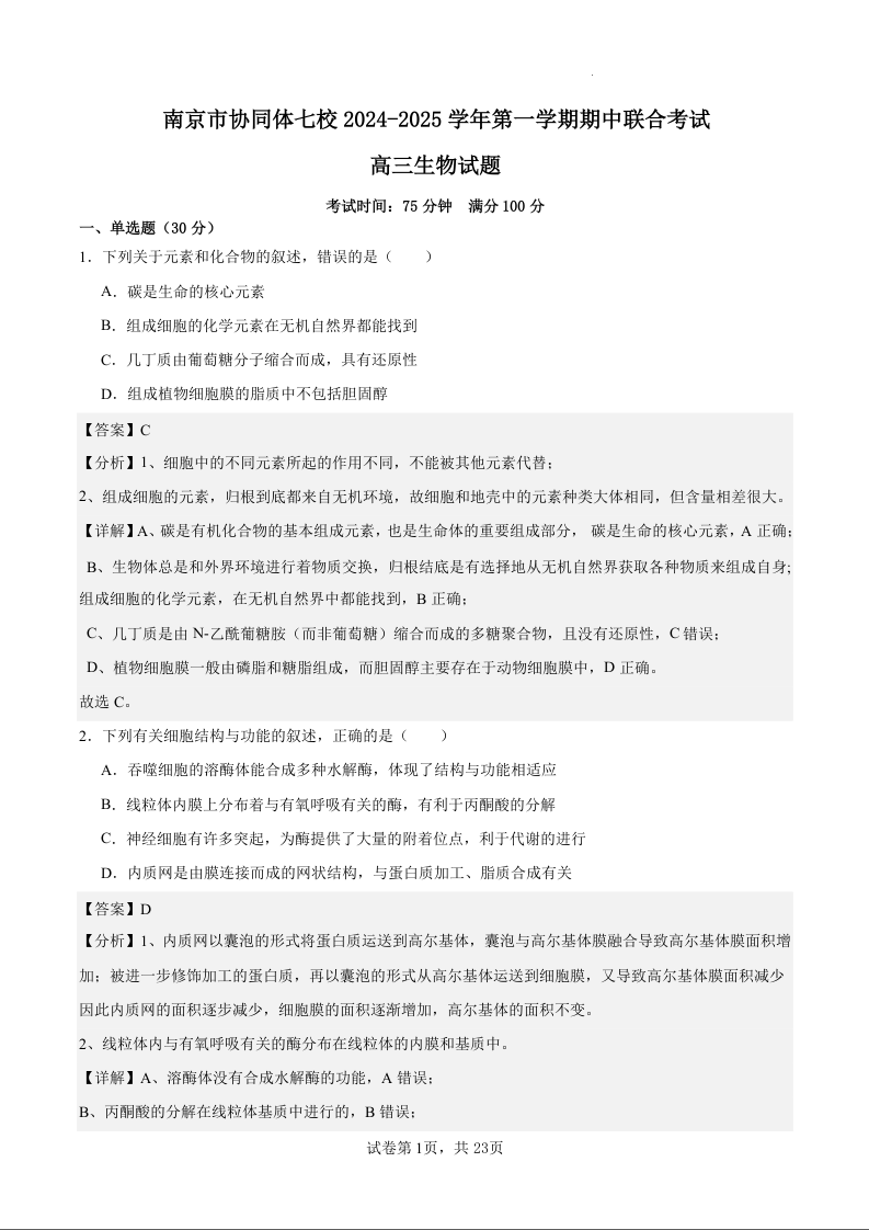 江苏省南京市协同体七校2025届高三期中联合考试生物(精品解析版)