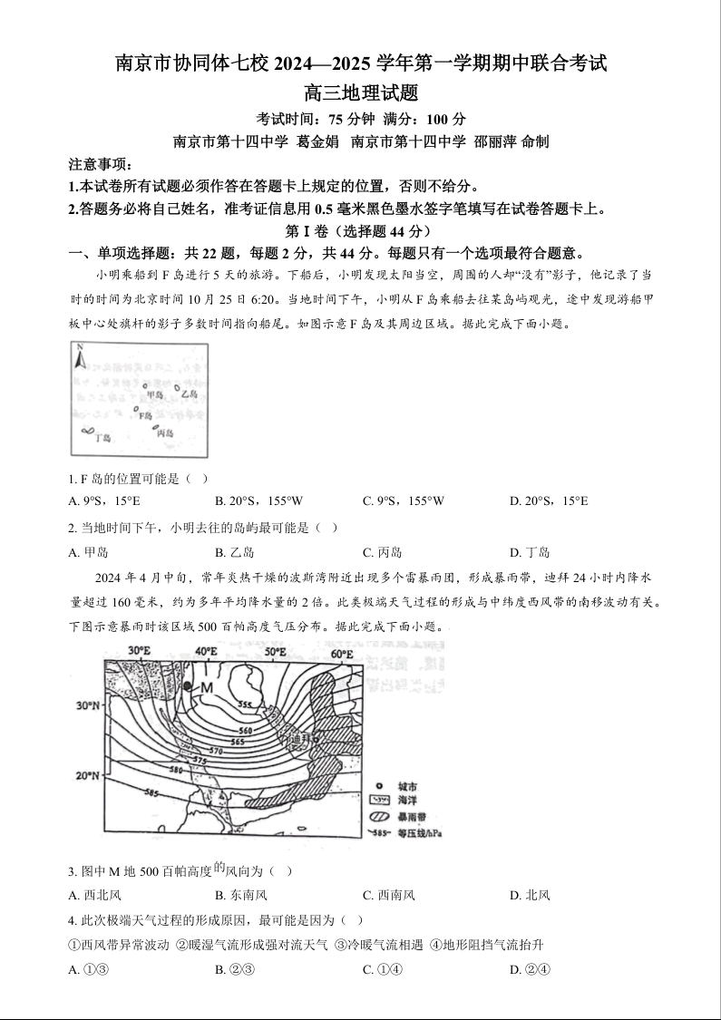 江苏省南京市协同体七校2025届高三期中联合考试地理(原卷版)