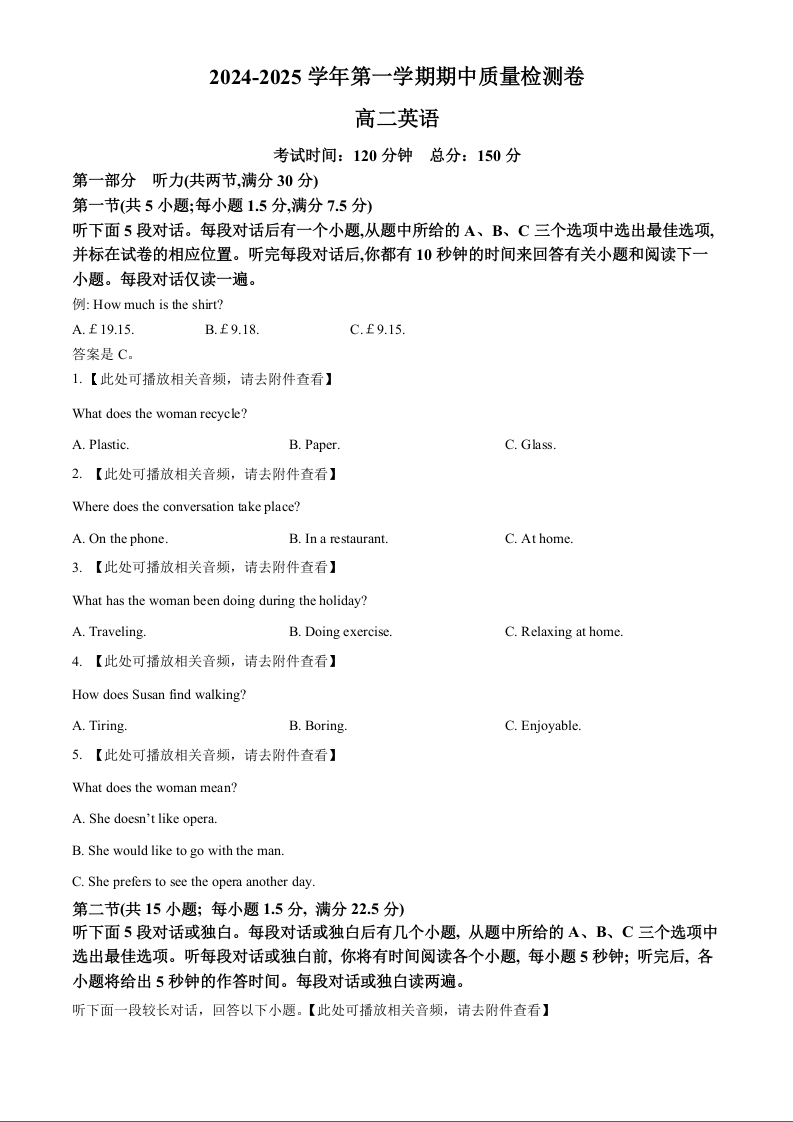 甘肃省武威市凉州区2024-2025学年高二上学期期中质量检测英语(原卷版)