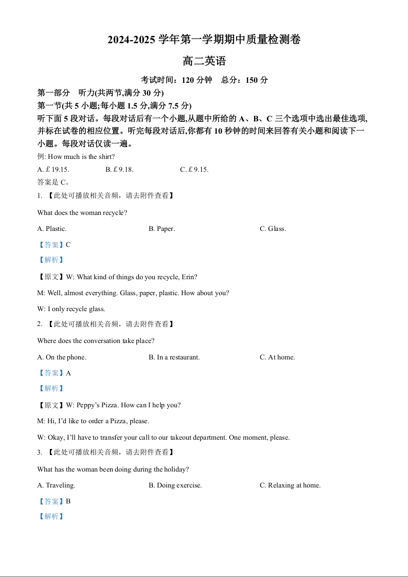 甘肃省武威市凉州区2024-2025学年高二上学期期中质量检测英语(精品解析版)