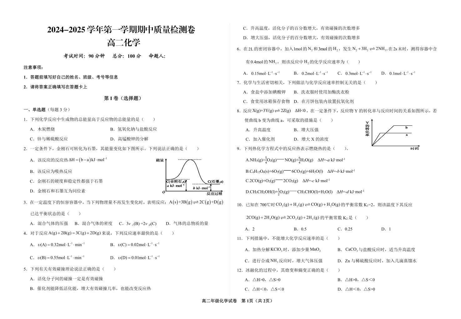 甘肃省武威市凉州区2024-2025学年高二上学期期中质量检测化学