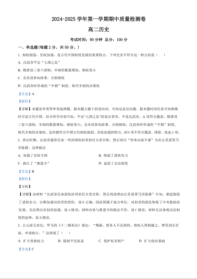 甘肃省武威市凉州区2024-2025学年高二上学期期中质量检测历史(精品解析版)