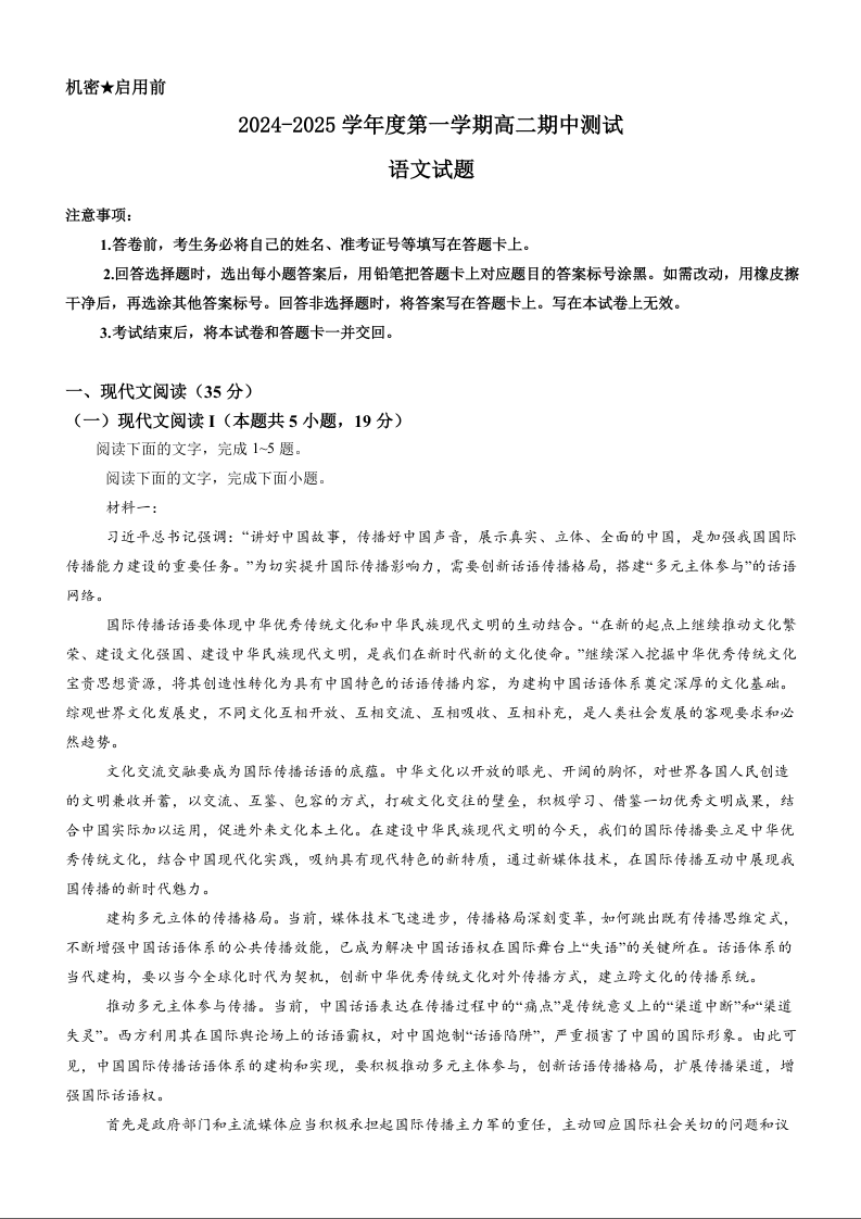 广东省阳江市高新区2024-2025学年高二上学期11月期中考试语文+答案