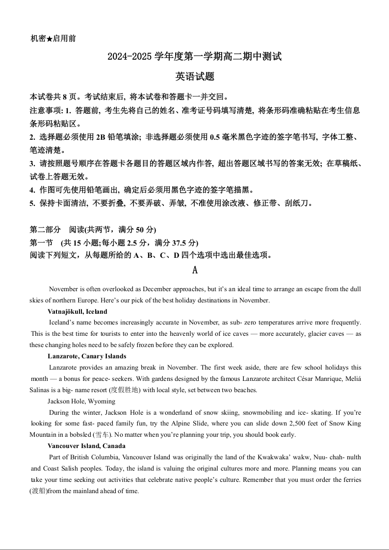 广东省阳江市高新区2024-2025学年高二上学期11月期中考试英语+答案
