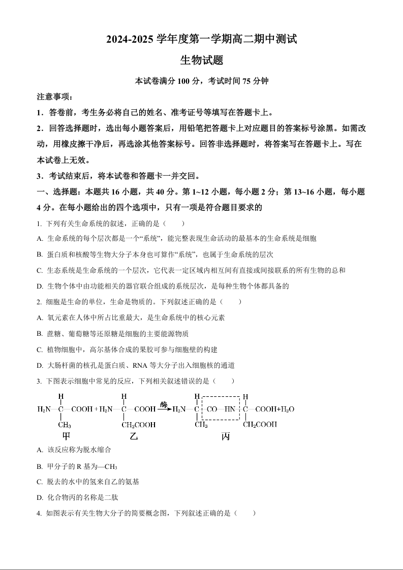 广东省阳江市高新区2024-2025学年高二上学期11月期中考试生物(原卷版)