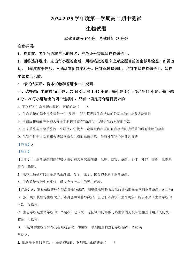 广东省阳江市高新区2024-2025学年高二上学期11月期中考试生物(精品解析版)