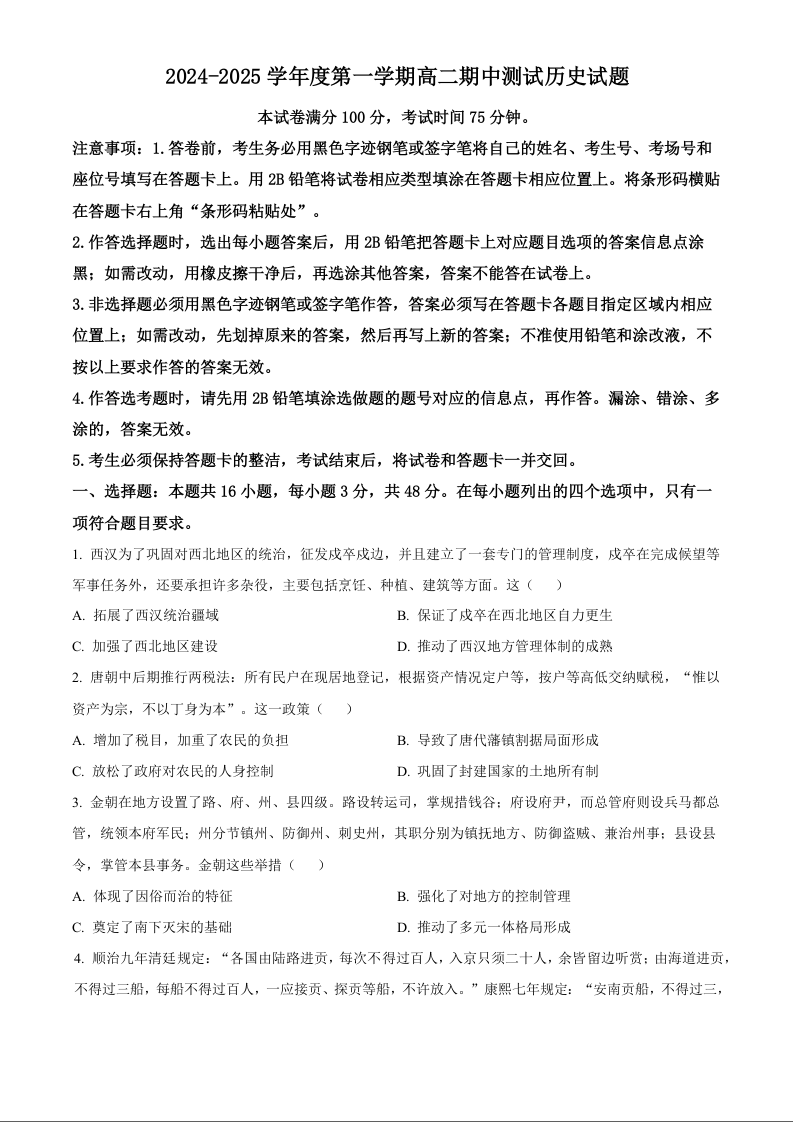 广东省阳江市高新区2024-2025学年高二上学期11月期中考试历史(原卷版)