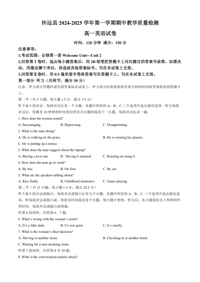 安徽省蚌埠市怀远县2024-2025学年高一上学期期中考试英语+答案