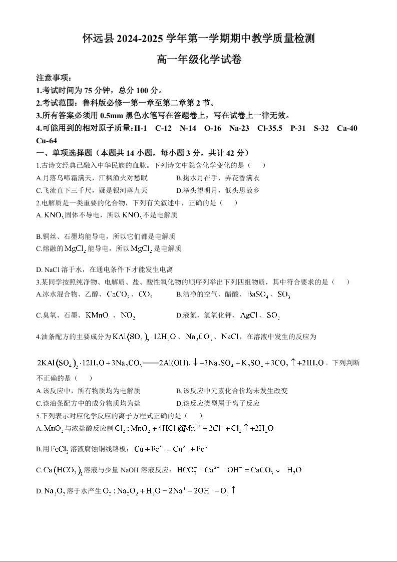 安徽省蚌埠市怀远县2024-2025学年高一上学期期中考试化学+答案