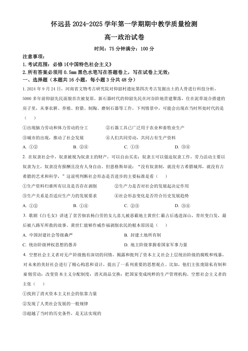 安徽省蚌埠市怀远县2024-2025学年高一上学期期中考试政治(原卷版)