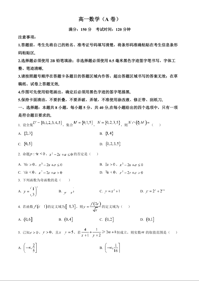安徽省鼎尖教育2024-2025学年高一上学期11月期中考试数学A(原卷版)