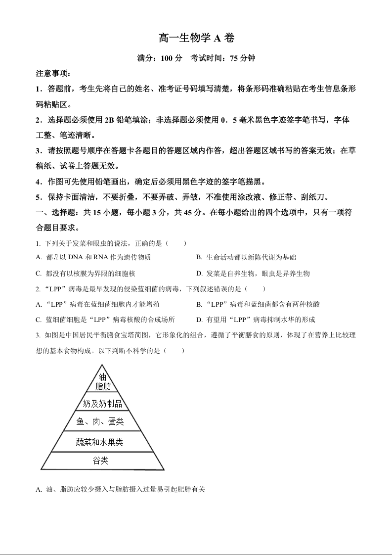 安徽省鼎尖教育2024-2025学年高一上学期11月期中考试生物A(原卷版)