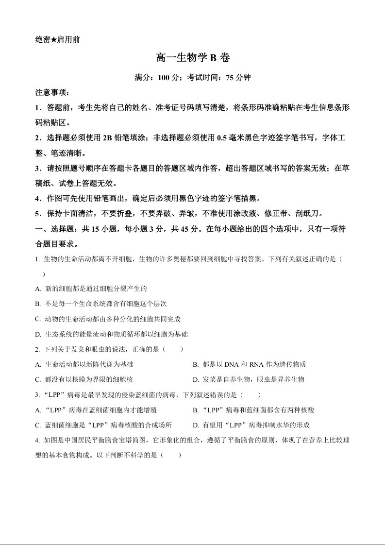 安徽省鼎尖教育2024-2025学年高一上学期11月期中考试生物B(原卷版)