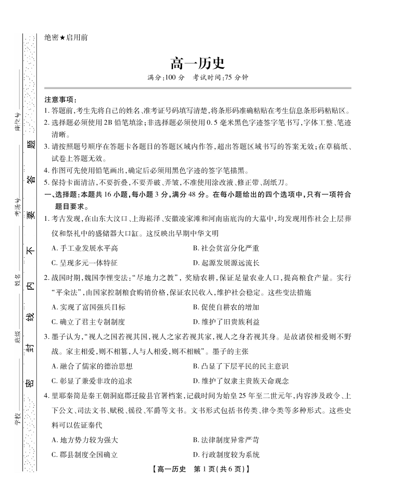 安徽省鼎尖教育2024-2025学年高一上学期11月期中考试历史
