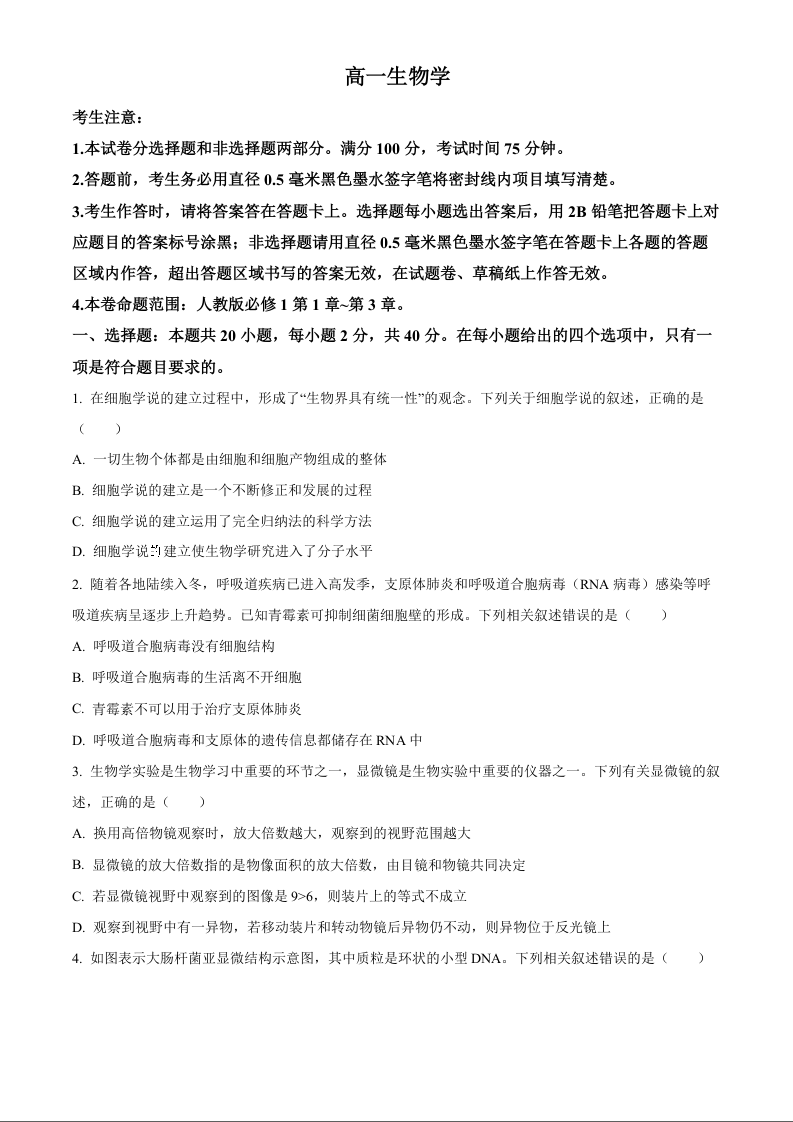 河南省九师联考2024-2025学年高一上学期11月期中考试生物学(原卷版)