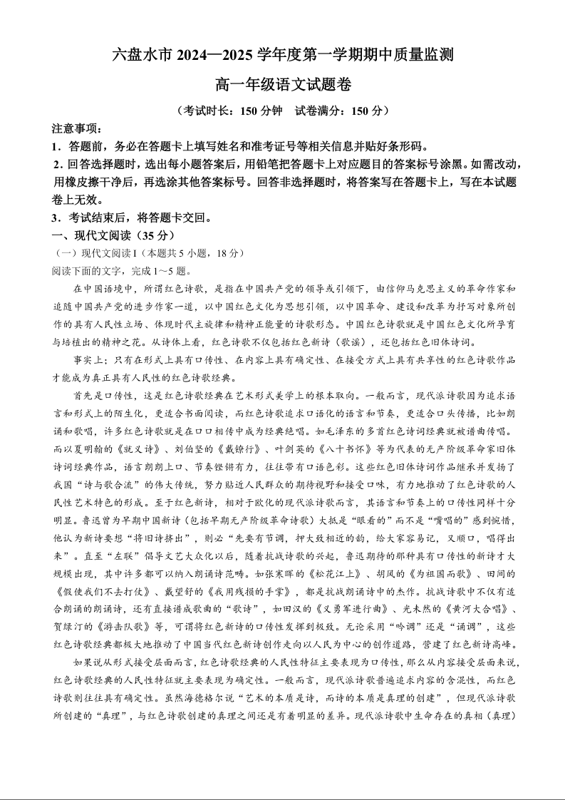 贵州省六盘水市2024-2025学年高一上学期11月期中考试语文