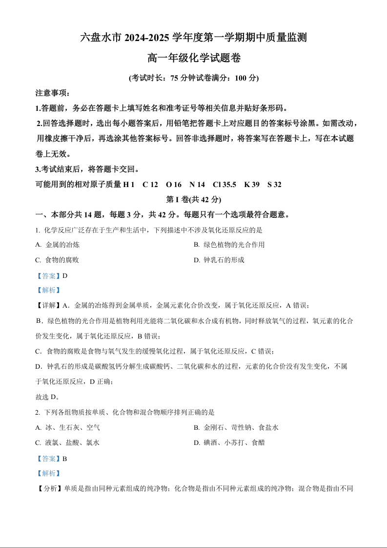 贵州省六盘水市2024-2025学年高一上学期11月期中考试化学(精品解析版)