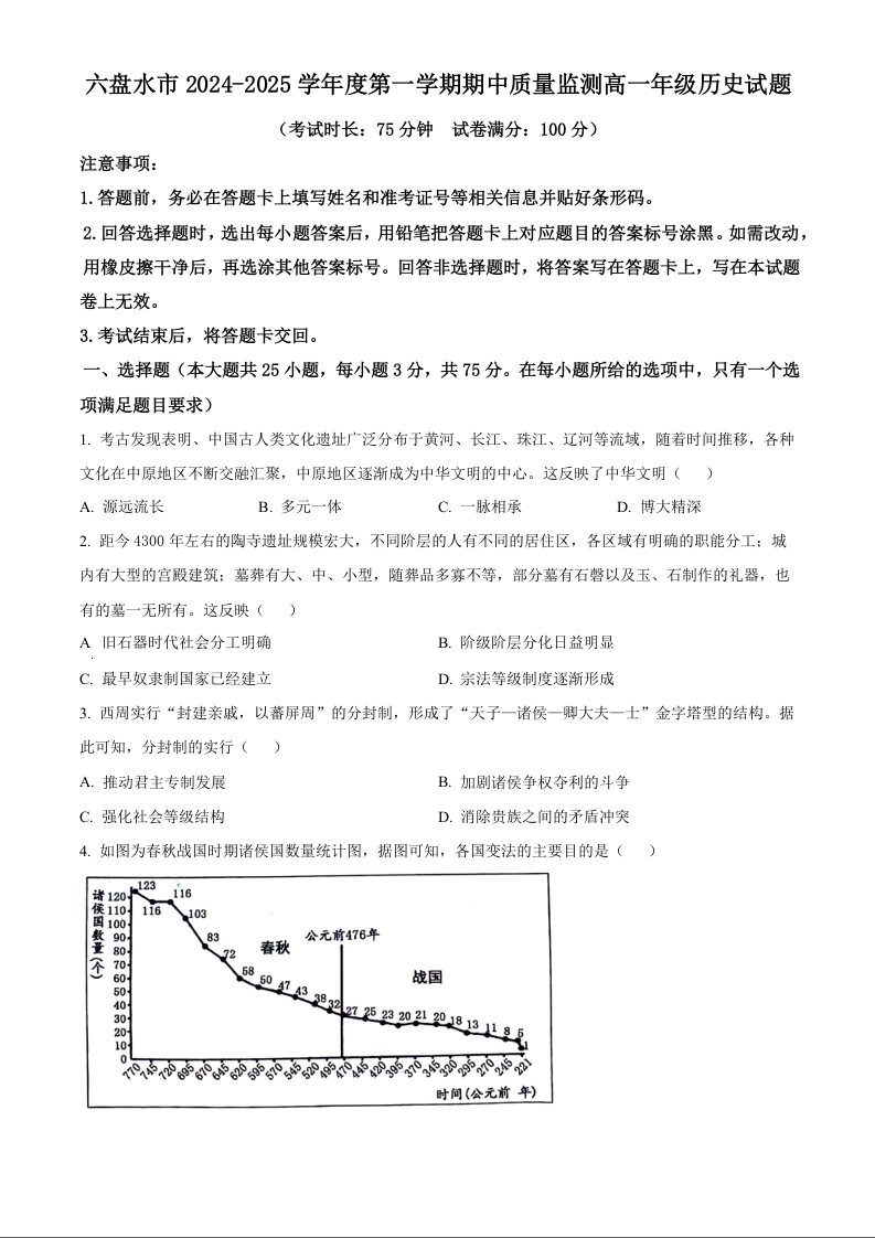 贵州省六盘水市2024-2025学年高一上学期11月期中考试历史(原卷版)