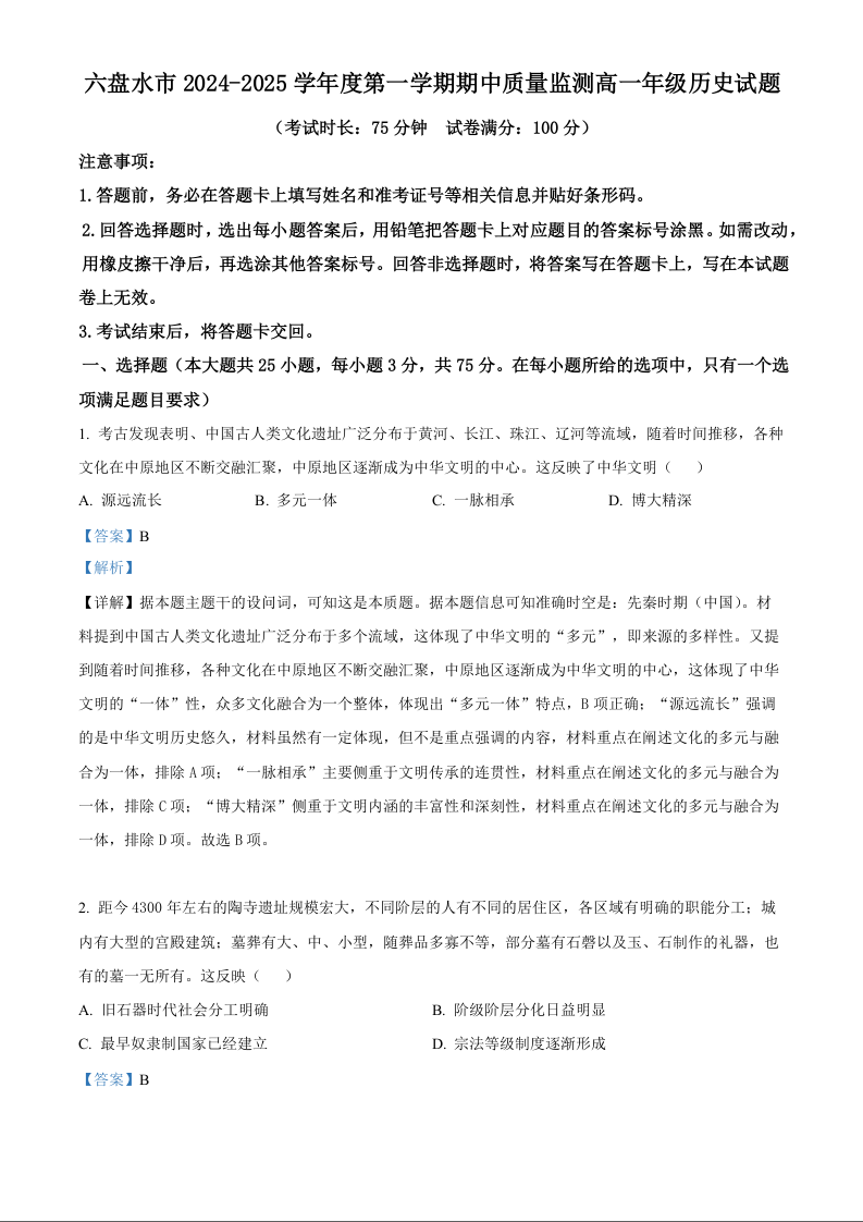 贵州省六盘水市2024-2025学年高一上学期11月期中考试历史(精品解析版)