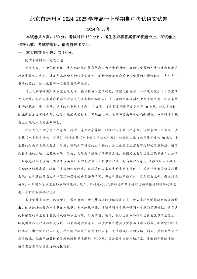 北京市通州区2024-2025学年高一上学期期中考试语文(精品解析版)