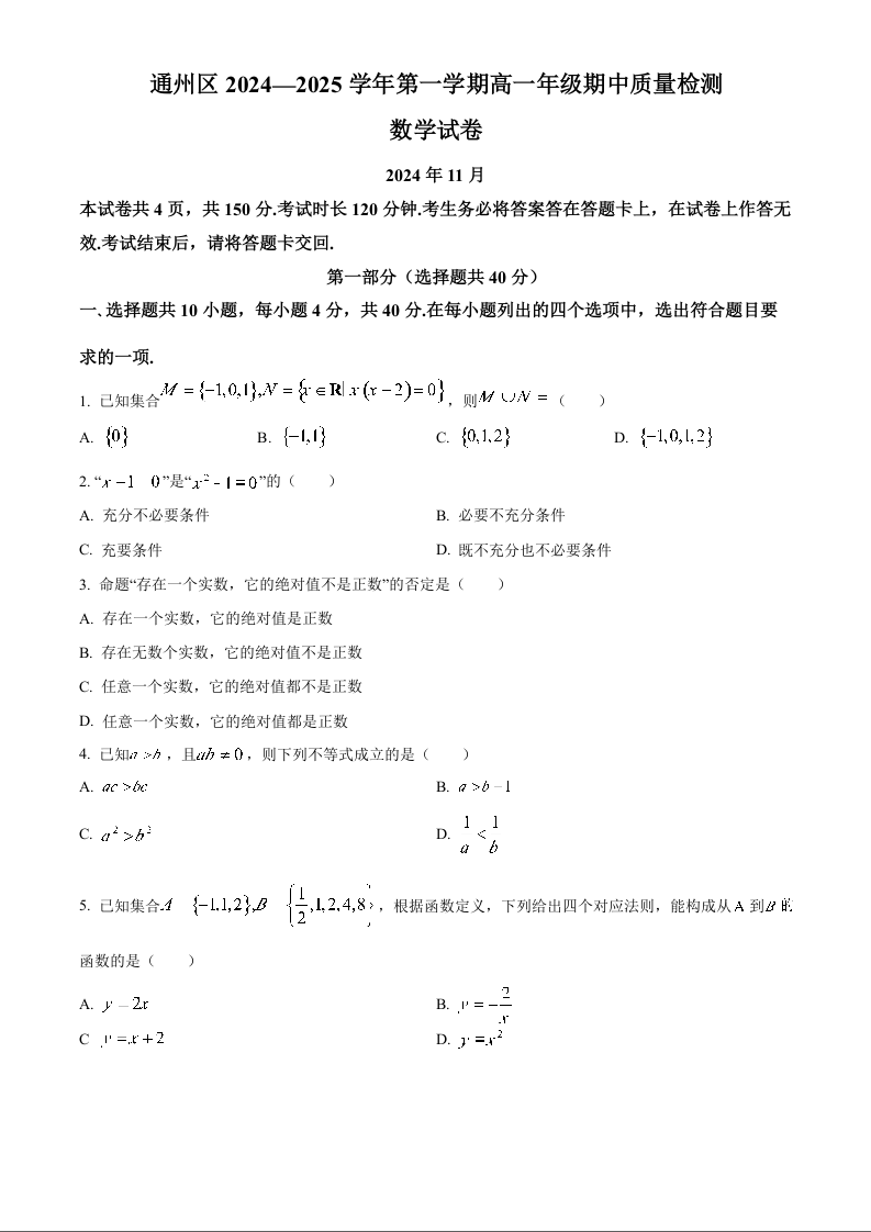 北京市通州区2024-2025学年高一上学期期中考试数学(原卷版)