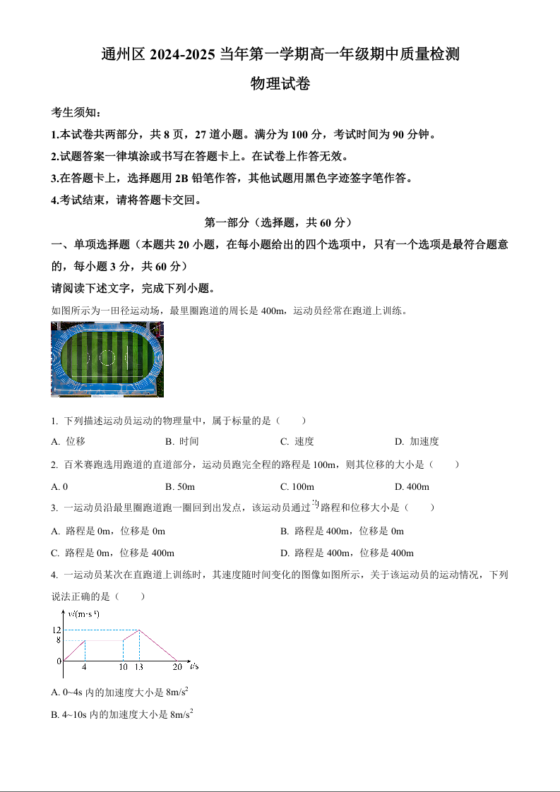 北京市通州区2024-2025学年高一上学期期中考试物理(精品解析版)
