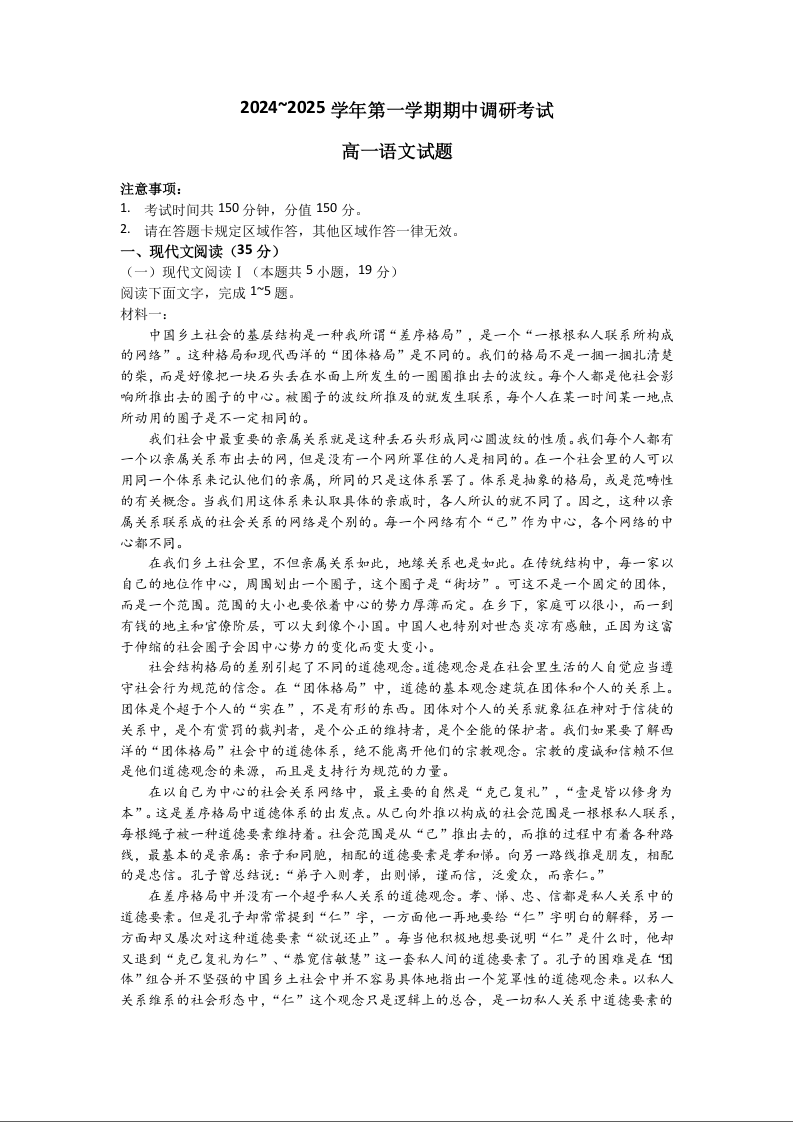 江苏省连云港市东海县2024-2025学年高一上学期期中考试语文+答案
