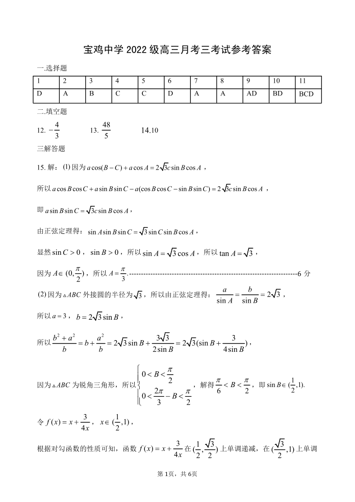 陕西省宝鸡中学2025届高三上学期12月月考数学答案
