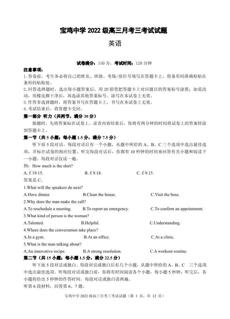 陕西省宝鸡中学2025届高三上学期12月月考英语