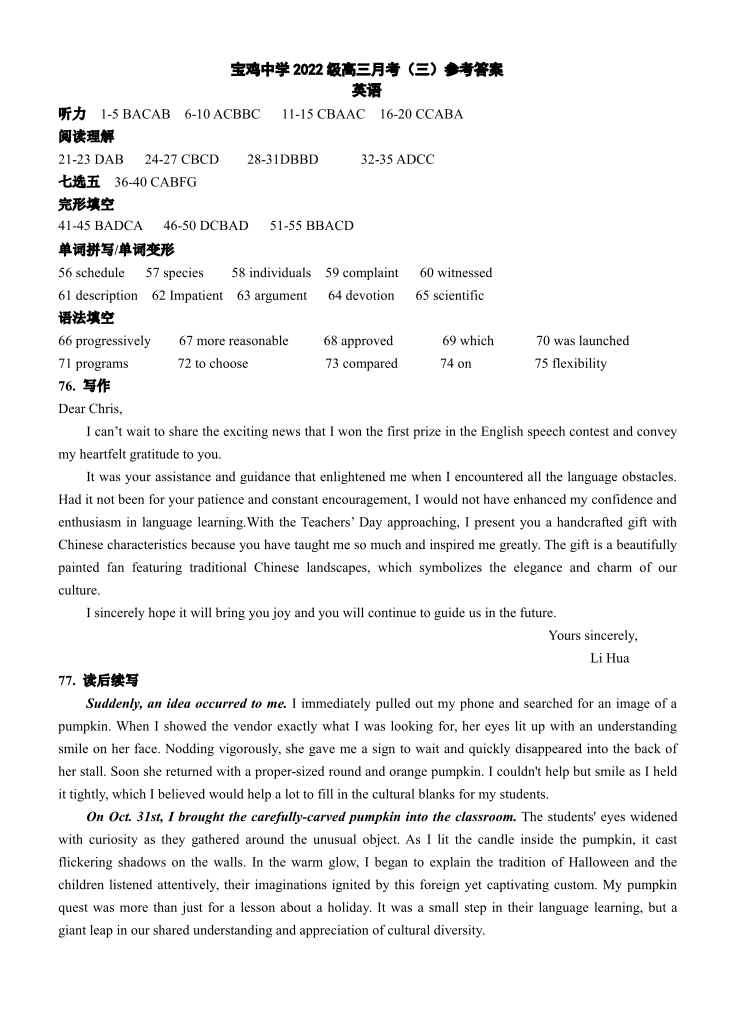 陕西省宝鸡中学2025届高三上学期12月月考英语答案