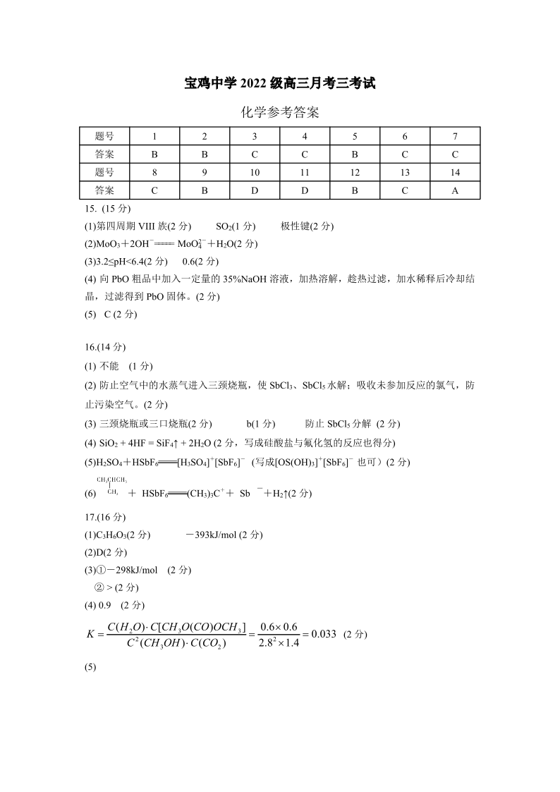 陕西省宝鸡中学2025届高三上学期12月月考化学答案