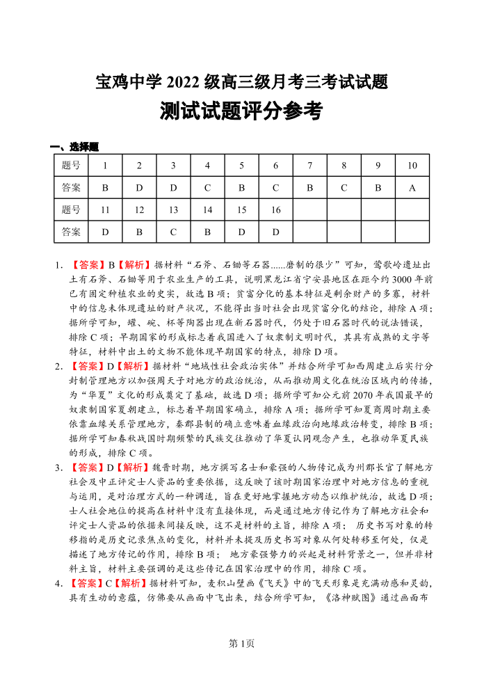 陕西省宝鸡中学2025届高三上学期12月月考历史答案