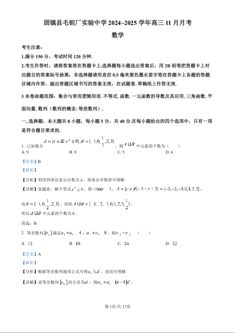 安徽省毛坦厂实验中学2025届高三11月期中考试数学答案