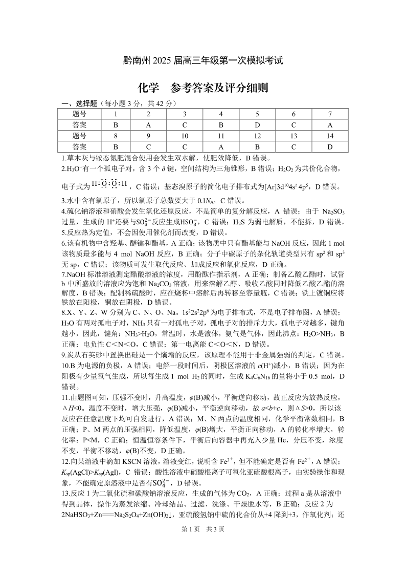 贵州省黔南州2025届高三年级第一次模拟考试化学答案