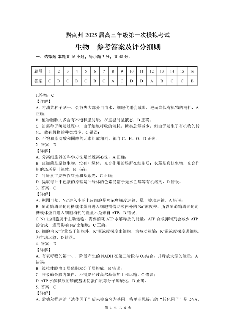 贵州省黔南州2025届高三年级第一次模拟考试生物答案