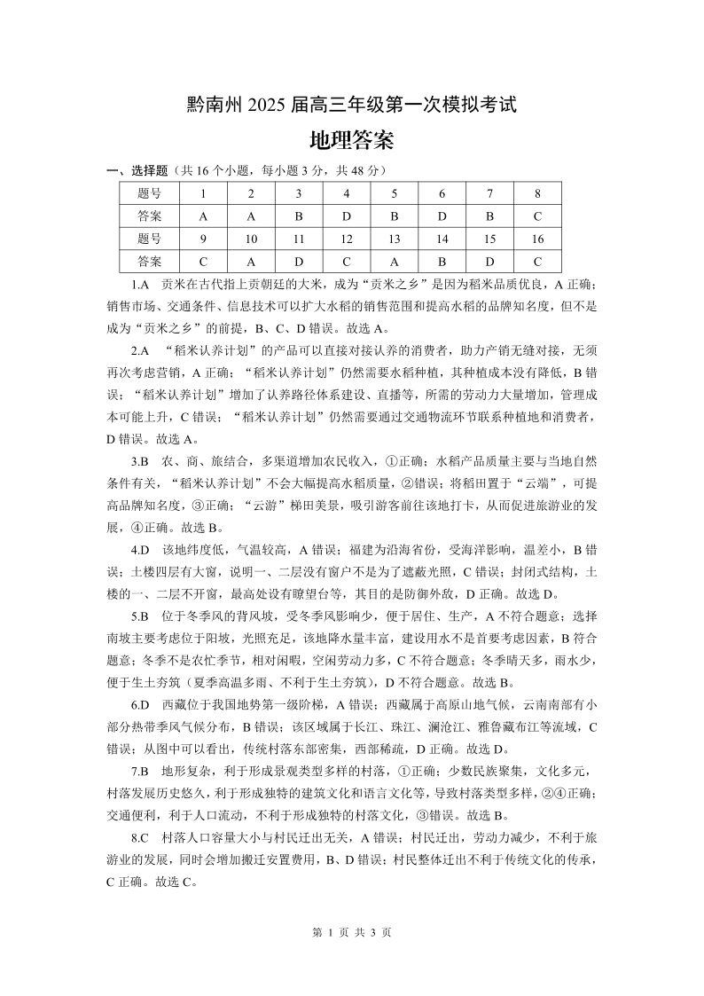 贵州省黔南州2025届高三年级第一次模拟考试地理答案