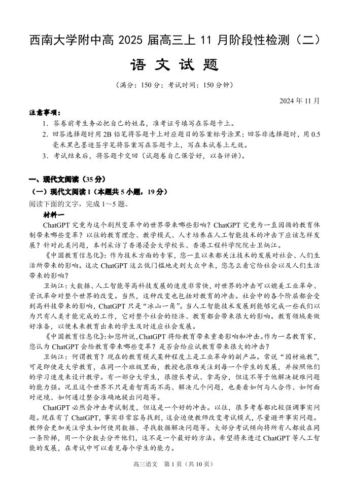 重庆市西南大学附属中学2025届高三上学期11月阶段性检测(二)语文