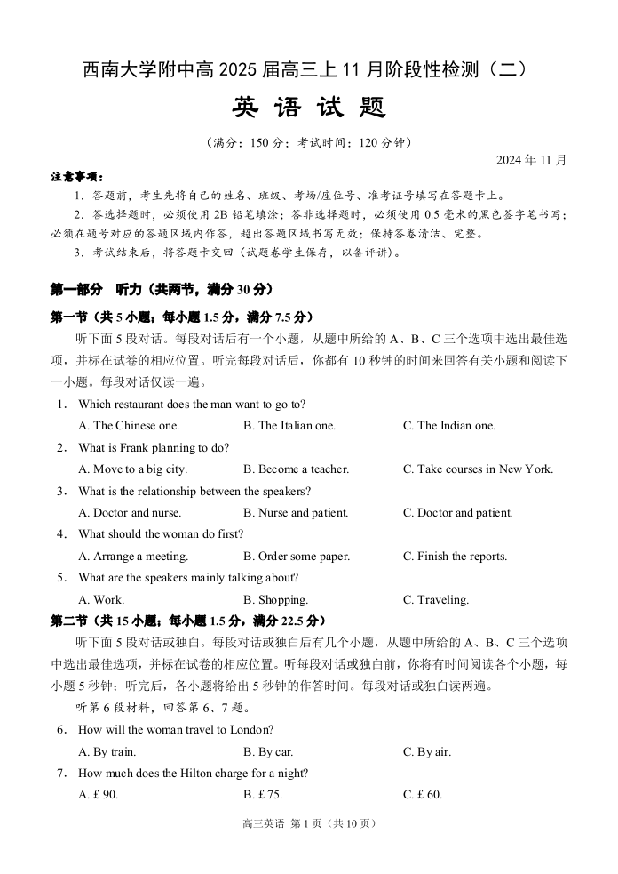 重庆市西南大学附属中学2025届高三上学期11月阶段性检测(二)英语